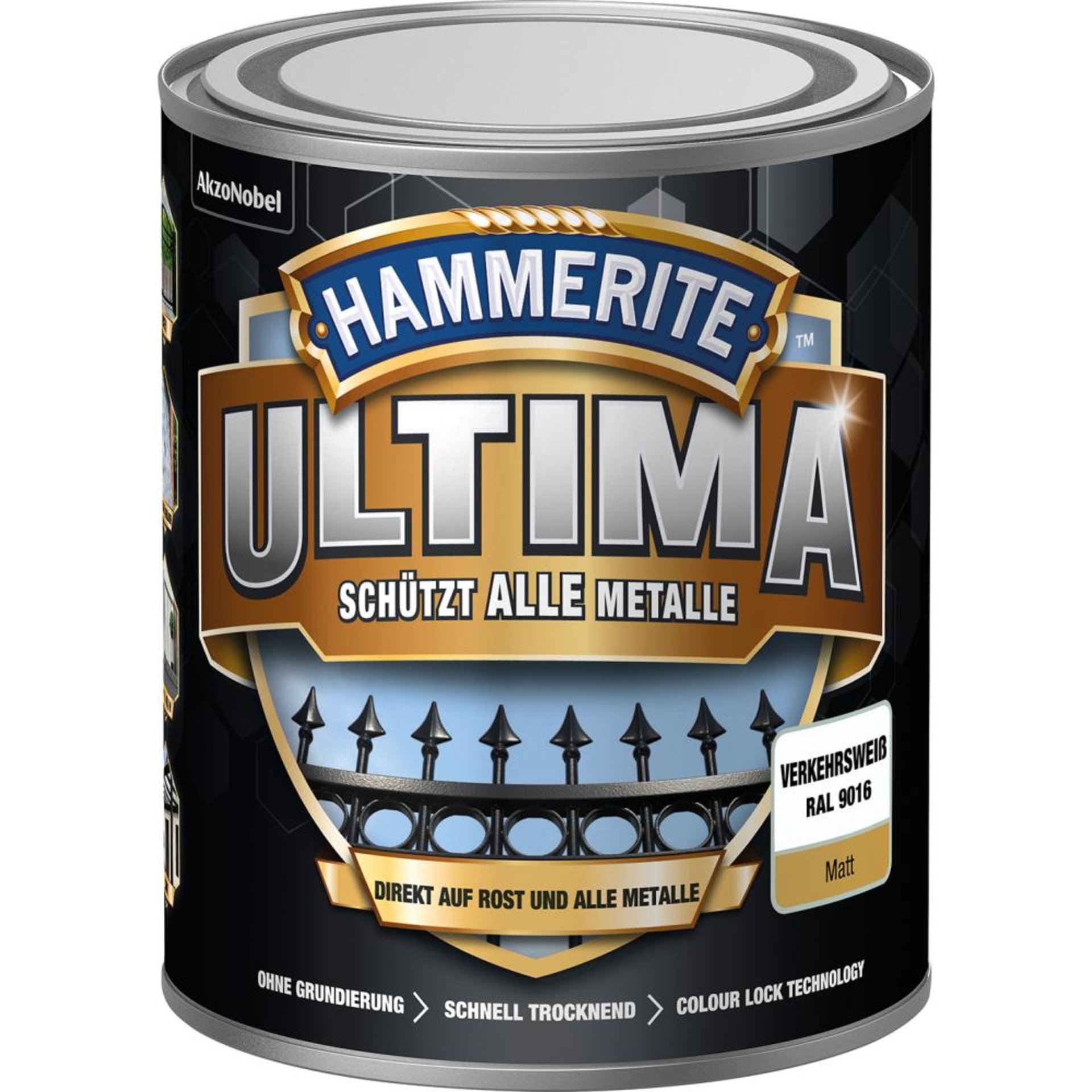 Hochwertiger Schutzlack für blanke wie auch rostige Eisenmetalle, Zink, Aluminium und Altbeschichtungen im Außenbereich. Rostschutz, Grundierung und Lackierung in einem. Hammerite ULTIMA bietet mit seiner speziellen Colour Lock Technology eine langanhaltende Farbton- und Glanzstabilität. Geeignet für Gartenzäune, Treppen- und Balkongeländer, Garagentore, Fenstergitter, Außenlampen, Fahrräder, Zierpflanzen-Rankgitter, etc.