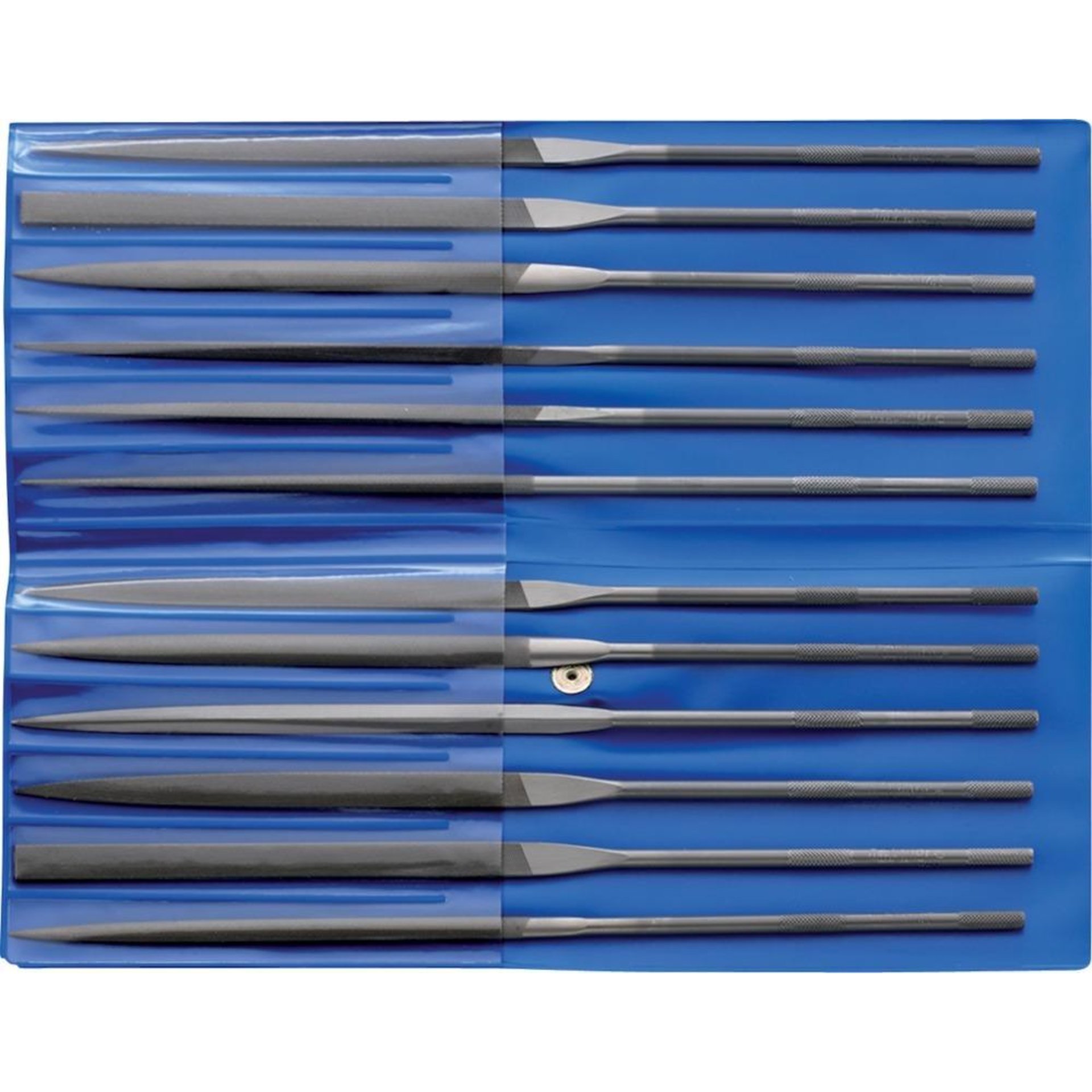 Inhalt :12 Präzisions-Nadelfeilen flachstumpf, flachspitz, 3-kant, 4-kant, rund, halbrund, Messer, Barett, flachspitz mit runden Kanten, flachstumpf mit runden Kanten, Vogelzunge, rund-oval.