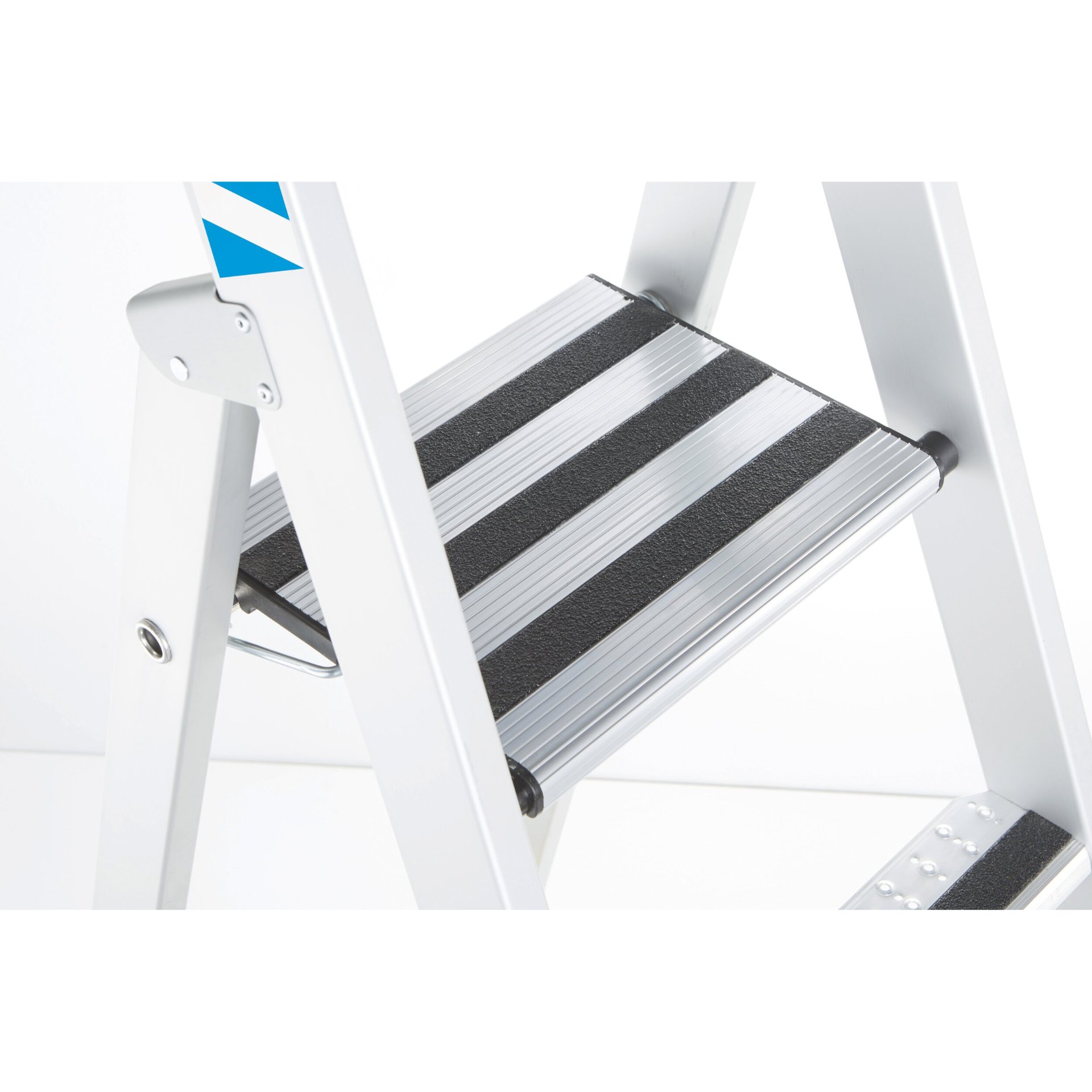 - Standplattform aus Alu-Strangpressprofil (300 mm × 250 mm) mit R13-Belag für sicheren und bequemen Stand auch bei längeren Arbeiten.