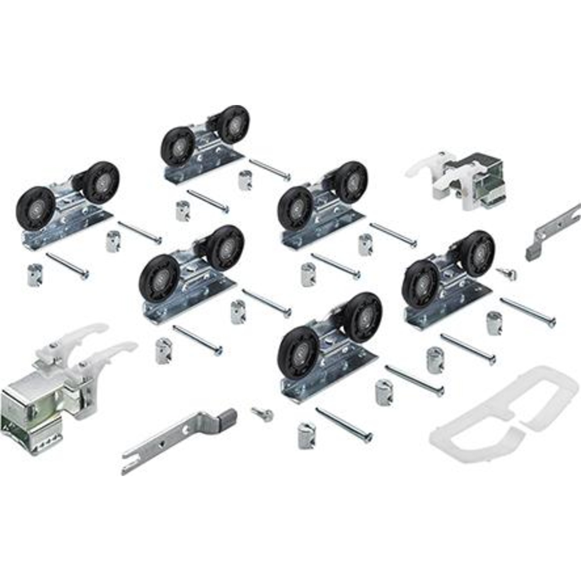 6 Stück Laufteile, 2 Stück Endanschlag für Laufprofil, 2 Stück Abstandhalter, 1 Stück Mittelabstopper Befestigungsmaterial